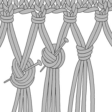 Um bei diesen Knoten eine gleich bleibende Höhe zu erreichen, ist es ratsam, den noch lose geschlungenen Knoten mit einer Stecknadel auf einer dickeren Unterlage aufzustecken. Dann erst die Fäden in Höhe der Stecknadel zum Knoten festziehen.
