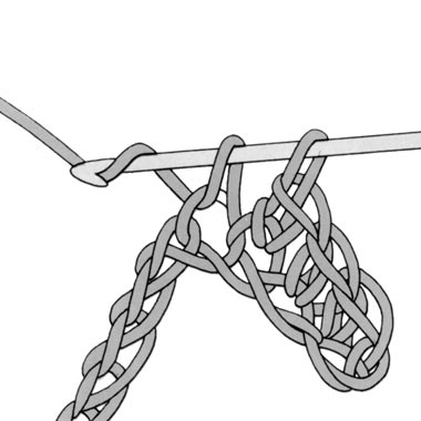 1 Umschlag bilden, in eine Luftmasche einstechen, 1 weiteren Umschlag bilden und den Faden durch die Luftmasche ziehen (Abb.8) ,(es sind jetzt 3 Schlingen auf der Nadel), wieder 1 Umschlag bilden und den Faden durch die beiden ersten Schlingen auf der Nadel ziehen (Abb.9). Die letzte Schlinge bleibt auf der Nadel. Für alle weiteren Stäbchen diesen Vorgang wiederholen.
