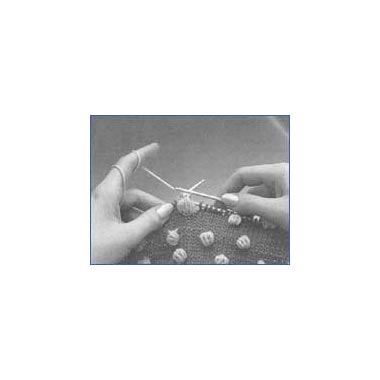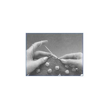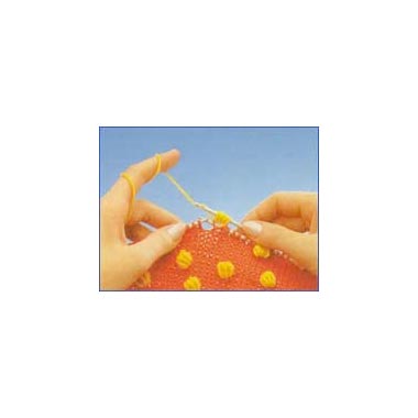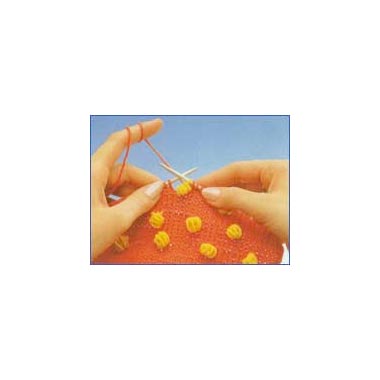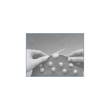 Will man die Spannfäden bei farbigen Noppen vermeiden, kann die Noppe auch zum Schluß auf das fertige Teil aufgehäkelt werden. Dafür sticht man an in der Strickschrift bezeichneter Stelle ins Gestrick ein und häkelt die Noppe wie auf der Vorderseite angegeben, schneidet den Faden ab und zieht ihn durch das Gestrick auf die Innenseite, wo Anfangs- und Endfaden verknotet werden.