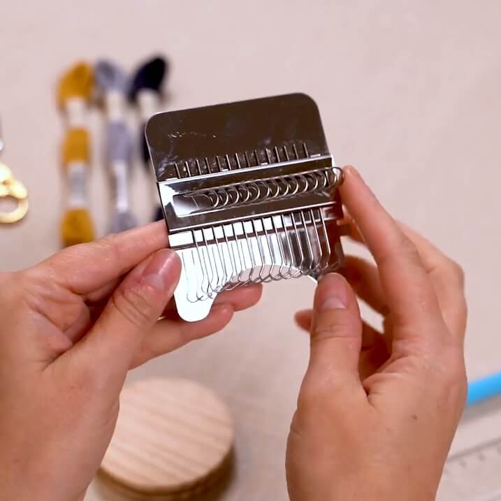 Bei diesem Mini-Webrahmen benutzen Sie Ihre Nadel wie ein Schiffchen. Fahren Sie mit dem Finger über die 14 Haken, um die Kettfäden abwechselnd zu heben und zu senken. Im Handumdrehen entstehen unter Ihren Fingern hübsche kleine gewebte Flicken.